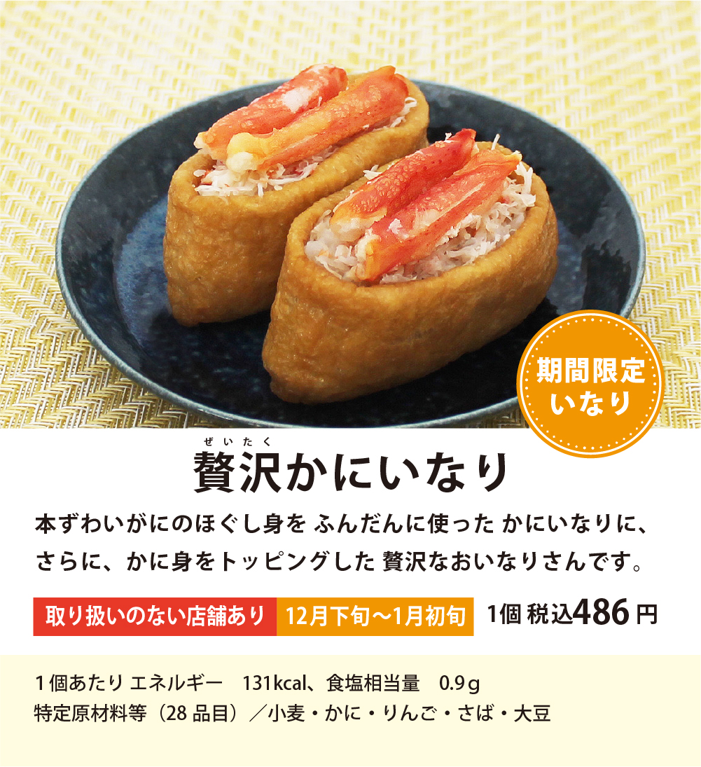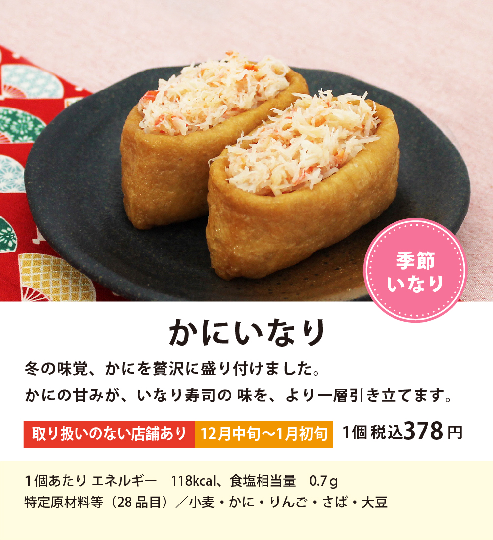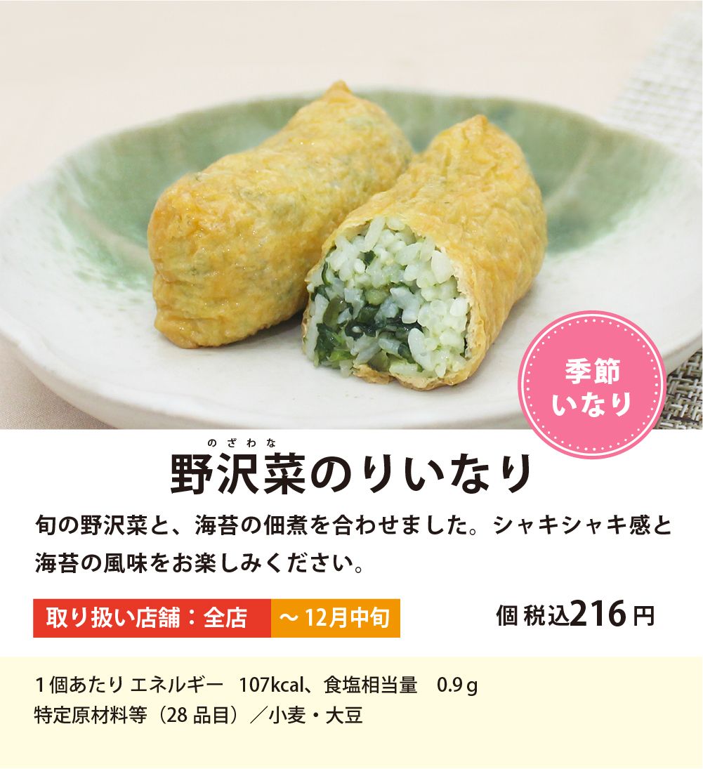 いなりすし専門店 豆狸 ひとつひとつ丁寧に「手」でつつみこむ それが豆狸のこだわりです 商品一覧 ※品切れや、取り扱いの有無が変更になる場合がございます 期間限定いなり 柚子れんこんいなり 柚子の香りとれんこんのシャキシャキ食感がベストマッチ!!れんこんの食感がアップしました。 野沢菜いなり 旬の野沢菜と、海苔の佃煮を合わせました。シャキシャキ感と海苔の風味をお楽しみください。 かにいなり 冬の味覚、かにを贅沢に盛り付けました。 かにの甘味が、いなり寿司の味を、より一層引き立てます。 贅沢かにいなり 本ずわいがにのほぐし身をふんだんに使ったかにいなりに、さらに、かに身をトッピングした贅沢なおいなりさんです。 豆狸 店舗一覧 >> 定番いなり 豆狸いなり 香り高い金胡麻に、椎茸、干瓢。ふっくら甘いお揚げで包みました。豆狸の代表商品です。 わさびいなり 上品な辛味のある花わさびと、お揚げのまろやかな甘みが良く合います。 生姜いなり 具材には「にんべん」自慢のかつお枯節だしで炊き上げた国産生姜煮、お揚げには国産生姜の果汁をお出汁につかいました。 五目いなり 歯ざわりの良いたけのこやれんこん、ごぼう、ひじきなど、たっぷりの具材を包みました。 黒豆狸いなり 国産の黒糖を使用し炊き上げたお揚げのコクが、味わい深い仕上がりです。 たこチビいなり たこ煮と紅生姜を、小ぶりでやわらかなお揚げで包みました。 くるみ味噌いなり 毎月17日いなりの日限定。くるみを、味噌とみりんで味つけし、 胡麻と合わせました。 程よい甘さと味噌の風味が絶品です。 こんにゃくいなり 毎月20日から26日限定。柚子入りの酢飯を、こんにゃくで包みました。ぷるっと爽やかな味わいです。 豆狸 店舗一覧 >> 店舗限定いなり 山わさびいなり くるみ味噌といなりと、こんにゃくいなりのみ、リード文に日にち足しました。北海道産の山わさびを使用しました。山わさびとちりめん山椒がアクセントになり、さわやかな辛さに仕上げました。 仙台味噌いなり みそ漬処「香の蔵」の仙台味噌で漬け込んだ胡瓜を合わせました。仙台味噌の豊かなコクが広がります。 鷹の爪大根煮いなり さっぱりとした大根漬けと鷹の爪を混ぜ合わせたおいなりさんに仕上げました。 穴子いなり たっぷりの穴子に、アクセントの柚子、椎茸、金ごま。お揚げは東京駅を思い浮かべるレンガ柄で 仕上げました。 まぐろ時雨煮いなり こだわりの釜炊き製法で炊き上げた「にんべん」まぐろそぼろふりかけと、まぐろの時雨煮を、赤レンガ柄のお揚げに包みました。 あさりいなり 旨みたっぷりのあさりの時雨煮に、枝豆、塩昆布をバランスよく合わせました。 パンダいなり 上野のお土産に最適な、パンダの焼き印を押したお揚げさんに、具材はたけのこと鶏そぼろ。老若男女食べやすく仕上げました。 ナポリタン風いなり 酢飯にトマトソース、コーン・パプリカを混ぜ合わせ、カットしたベーコンをトッピング。”洋風”と”いなり”のコラボです! 吟鰻いなり 鰻の蒲焼きと玉子焼きを盛付けた贅沢な一品です。手土産にもおすすめです。 ベビー梅しらすいなり 歯ざわりの良いカリカリ梅としらすの旨みがよく合う、梅しらすいなりが小ぶりなサイズで作りました。 志ば漬いなり 「土井志ば漬本舗」のしば漬けを2種類合わせました。程よい酸味と食感をお楽しみください。 チリメン山椒いなり 京都東山「はれま」の チリメン山椒を使用しました。京都のお土産におすすめです。 虎柄カツいなり インパクトのある虎柄のお揚げに、ボリュームのあるカツを盛り付けました。野球観戦やお土産にもおすすめです。 牛めしつの田 和牛いなり 甘みのある上品な口当たりの 国産牛肉煮をふんだんに盛り付けました。 そばめしいなり 細かく刻んだ焼きそばと酢飯を混ぜ合わせた、神戸発祥のB級グルメをおいなりさんにしました。神戸でそばめしに使用されている“ばらソース”を使用しています。 梅の実ひじきいなり 厳選した肉厚のひじきと歯ごたえのよい梅の実を使った、爽やかな風味の逸品である“太宰府十二堂えとや”の“梅の実ひじき”を使用しました。 豆狸 店舗一覧 >>
